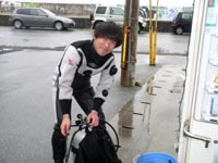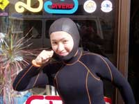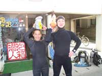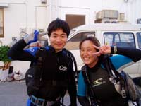 武内さん 前回はOW取得。そして 次のステップへ。今回はアドバンスコースに挑戦です。右の写真は、はりきってる武内さんのモジモジ姿。似合ってますね。今日は中性浮力のとっくん、ディープダイビング、コンパスナビゲーション、の3ダイブ。のみこみが良くて優秀でしたよ。水深30mの世界から空気と海水をペットボトルに入れて陸に持ち帰ったら、プしゅっとおいしそうな音がしましたね。次回のダイビングでアドバンス合格予定がんばるぞーー。 |