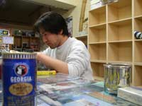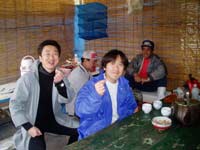 山本さん 武内さんと本島マエガネクの港からのファンダイビングです。武内さんは初めてのボートダイビングで、憧れだったというバックロールエントリーに挑戦。上手くできましたね。そして巨大コブシメにコブシメの卵がサンゴに産み付けられているところも見れました。寒い日でしたが漁師の人たちのだんらんスペースでストーブにあたり、(右の写真)船長さんがとれたての貝(テラジャー)をふるまってくれたりダイビングの合い間もわきあいあいの素敵な時間でした。 |