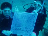 菊リンスクール最終日。みごと合格です。今日からオープンウォーターダイバーです。めでたい!!しかも今日は、菊リンのお誕生日です。重ねがさねめでたい!!ラストダイブは真栄田岬の洞窟へ行きました。階段でハァハァしたけど、あの綺麗さはその価値ありでしょ。あしたは初ファンダイブで初ボート。あこがれの慶良間へ出発だね。ううう楽しみ〜。 |