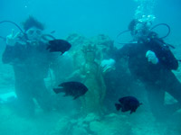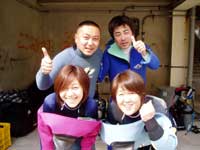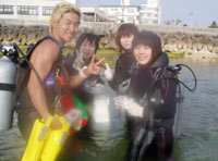 東京のダイビングショップ あっしーさんからのグループが潜りに来てくれました。メンバーは、みどちゃん。みっちゃん。みのるさん。そしてパッション(佐々木インストラクターともいう)到着し、おいしい沖縄そばで腹ごしらえをしてから砂辺の海に潜りました。水中観音さまに、楽しいダイビングになるようにお祈りしました。お金持ちに。。。とかモテますように。。。と祈った人もいたようでしたが。南の島のカラフルな魚や海蛇ソフトコーラルの景色や手触りも堪能しました。 |