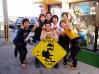 慶良間体験ダイブ女のこ4名チーム。さくらちゃん、あきちゃん、えみちゃん、そして班長こと小川さん。みんな初体験のダイビング。耳抜きや呼吸の練習をしていざ海へ、エサをあげたら魚がいっぱいよってきたね。水中でじゃんけんをしてばつゲームしたり光がキラキラの水面にみとれたり、二モに合う事もできたね。その後4人はフードをかぶりスノーケル。プロっぽかったよ。帰りに船から『クジラ』の姿がみえたね。ラッキーーー!タイタニックごっこも挿入歌付きでおもしろかったね。タイタニック写真みたいなぁ。みんなまた来てね。まってるよ。 |