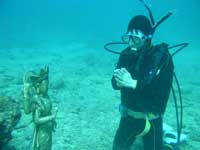 横浜からお越しの小松さんです!体験ダイビングは初めてという小松さんでしたが、とても落ち着いてましたよ!水中ではわらわらと寄ってくる魚、魚、魚に大喜びでしたね!!おまけにカラフル!!観音様にはまたまたビックリです(笑)私の嘘言症の疑いを晴らしてくれる証人になってくれてとっても嬉しいです(笑)思い出ノートにも観音様入りのかわいい絵日記書いて頂いてありがとうございます!!今度は是非妹さんも体験ダイビングにいらして下さい!!お待ちしていま〜す!! |