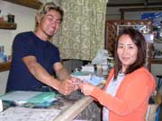 山口県から来てくれた。ゆきこちゃん、ひろしくんの体験ダイビングです。説明の飲み込みもはやく、海でも余裕の非常に優秀な2人です。さらにノリもいい!!フードをかぶってスケート選手の真似をしたり。。。たくさんの魚にかこまれたね、へんてこな形のナマコにであったり、ぐるくまって魚の大群とも遭遇したり、楽しかったね。 また遊びにに来てね。洞窟も必見だよ。水族館はどうだった? ひろしくんはガラスにへばりついてた?ゆきこちゃんはもうすぐ新社会人だね。がんばってね応援してるよ。(あっ、ホーリーが化粧ポーチまさぐってゴメンナサイね。自分達は化粧のできない仕事でいろいろ、めずらしかったのね。) |