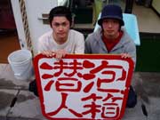 とってもノリのいいまーちゃんとつよしくんの体験ダイビングでーす。店に到着した時からノリノリのふたり。潜る前はちょっと緊張してたけど、海に入ればもうヨユウ。元気に魚をおいかけてました。海から上がったら『やっべー!!おもしれーーー!!』の声。ってなわけで更にもう1ダイブもぐる事に。こんどはさっきより遠くまでおよぎました。自分達でふわふわーーって空飛ぶみたいにおよげてたね。うんうん。なかなか上手かったぞ。穴をくぐったり、写真をとったりもしました。そして夕方からのお店の飲み会にも参加してくれました。サラリーマンになっても。休みがとれたら絶対、また遊びにくるんですよ。沖縄の海は最高さぁ〜。写真も送ってよぉ〜。 |