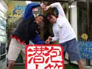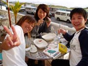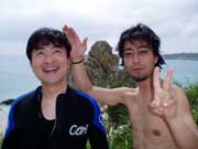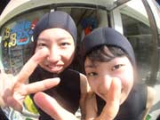 ほりちゃんでみっちゃんのライセンスコース初日です。ほりちゃんは静岡出身。でみっちゃんは大阪出身。そんな2人は沖縄の大学に通っている女子大生です。ふわふわぁ〜んとした雰囲気のかわいい2人です。2人とも水中でとてもおちついていて上手です。お魚が大好きなようで、一生懸命つかまえようとしていました。→の写真はほりちゃんがでみっちゃんをいじめている所。ではなく海からあがってお湯を浴びてる至福の時です。あったかで気持ち良かったね。 |