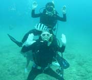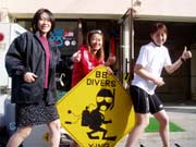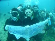 モジモジ君が似合ってる2人はスクール2日目のでみっちゃんとほりちゃんです。今日は水中で器材を脱いでからまた着るという、大わざに成功!BCも自分で調節して、ずいぶんダイバーっぽくなってきました。潜行姿勢にもみがきがかかってきて、なかなかいい感じ。学科のテストもみごと合格。いよいよあしたは最終日。ライセンスゲットはもう目前です。この調子で明日も頑張ろう!! |