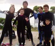 今日はわいわい6名での体験ダイビングです。メンバーはあやこさん、りゅうじさん、としやさん、こずえさん、さちこさん、そしてみんなのアイドル8歳のジュンヤくんです。今日は瀬良垣ビーチへ移動して、潜りました。みんな海のなかではしゃぎまくってました。まっくろななまこや、ブルーの魚、ほそながーーーい魚もいましたね。みんなとってもたのもしい泳ぎっぷりでした。次回はもっと深く遠くの海ダイビングにも挑戦しましょう。じゅんやくんも本当に優秀。耳抜きもとっても上手にできてたね。また一緒に海で遊ぼうね。 |