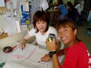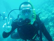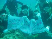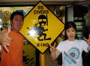 大賀さんとマンツーマンの慶良間ファンダイビングを楽しんできましたよ。あこがれの慶良間!船がゆれるかもとこわごわでもありましたが、思いっきり楽しめたね。水は綺麗だし、珊瑚もビューティフルだし、お魚もいっぱい。ミニミニカメもいたしね(??)この日の夜はいっしょにみんなとご飯を食べに行きました。『ダイビング』の手話をどうやるか教えてもらいました。びっくりジェスチャーでした。ねぇねぇところで、マンタダイビングは藤井さんと行くのかしら?? |