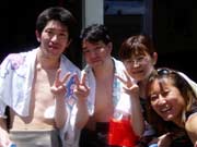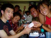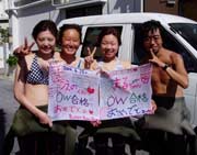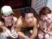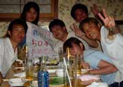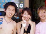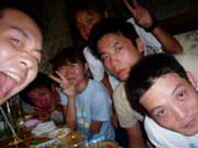 台風がくるぅ〜〜と、あわてて朝から2本潜りました。花畑&チーズケーキポイントです。今回は台風が近づいてきているので、念願の慶良間にはいけなかったけれど、なんとか3日間潜れてよかったよんね。それに昨日の飲み会は最高に盛り上がったし(→の写真)1つだけ山盛りのわさびの入ったのりまきを、みんなでこわごわ選ぶロシアン鉄火巻にチャレンジ。かなりのわさびの量らしい。ヒットした人は店の人とジャンケンし勝ったら泡盛1本もらえるのです。まずヒットしたのはレインボーやよい。あの時の顔は忘れられないわ。よく飲み込んだねナイスファイト!!(ヒューヒュー)次のヒットはゆにちゃん、そしてジャンケンで勝ち泡盛ゲット!!(ドンドンパチパチイぇーイ!!)えらいぞ〜。みんなと飲めて、潜れて楽しかったじょ。またいつでも遊びにきてね。みんなででも、そrぞれでも。まってるよん。掲示板参加もよろしくねっ!うううビデオ楽しみ〜。 |