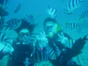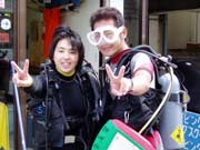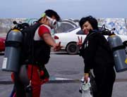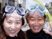 丸ちゃん、上野くんのスクール2日目です。今日は砂辺に潜りました。エア切れの対処方や、器材脱着、ウエイト脱着にも挑戦! マスクはちょっぴり苦手だけど、女は根性!きっと克復できるよ。リラックスして挑戦してみようね。今日は学科も合格したし、もうすぐダイバーになれるぞ!ファイトー!!!明日はもっと写真もとろうね。最終日だもの楽しまなくっちゃね! |