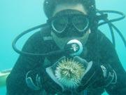 昨日に引き続き体験ダイビングされたねもっちゃんとたのさんです。人生の大先輩に馴れ馴れしいとは思いましたが、気さくな方達だったので普通に呼んでしまいました。ねもっちゃんのマスクに水が入るのと、たのさんは耳抜きが気がかりだったけどマスクは、他のと交換することで解決しました。その後は二人ともスイスイ泳いで昨日よりドンドン深場に行きましたね!!ナマコでみんなが見ていないから出来ることをしましたね!!あのたもさんがそんなことをするなんて!!!ワタシ、ビックリデ〜ス☆今度は洞窟に行きましょうネ |