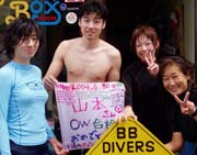 OWスクール初日の北海道から来てくれた山本さんです。 水陸ともの非常に優秀!!な山本さんです。りょうこびっくりです。すんごくおちついているし、センスあるぅ〜。学科も予習の成果か、スルスル進み全問正解あっという間の合格です。1問も落とさず、パーフェクト!!最終日にはかなりイケてるダイバーになるはず。 明日もこの調子で、楽しく練習しようね。 |