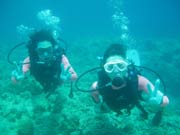 スクール2日目さつきちゃんちえちゃんです。だんだんダイビングになれて来たね。練習もどんそこ終っていきます。マスクとったって、へっちゃらの2人です。お勉強も合格!!あした潜ったらいよいよダイバーだね。ライセンスはもう目の前だ!ううう楽しみだねぇ〜。明日は真栄田岬へいっちゃうぞ!階段は大変だけど、綺麗な海だよ!みんなでわいわい遠足気分で行こうね! |