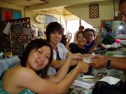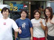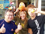 岡本さんチーム本日、沖縄上陸!急遽ジンベイ鮫ダイビングツアーに挑戦する事になりました。うひゃひゃーーと盛り上がってる人、緊張でもりさがっていく人、いろいろでしたが、みーーんな、8メートルあるジンベイ鮫に触る事ができました。鮫肌だったねぇ〜。お店にもどってから、近くのそばやで空腹をみたし、その後4人は那覇のに向かいました。きっとみんな飲むんだろうなぁ〜。明日はケラマだね。楽しんで来てよ〜。 |