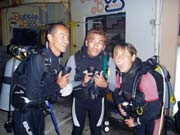 なぎさちゃん 講習2日目です。本日はたよれるオトコ大野さんも一緒です。おおのさんは今ダイブマスターになるべく、デモンストレーションにみがきをかけている所です。大野さんは渚のウエィ脱キルや器材脱着のスキルの上手さにジェラシ〜すら感じたようです。なぎさちゃんどんどこ上手くなってきたねぇ。もうすぐ合格だぞ!午後は学科のテスト!50点満点中48点以上なら、ミスターしんごが『塩せんアイス』を買ってくれるというので、なぎさもそして教える私に気合いがはいります。そしてみごとアイスゲット〜!!しんご、ごっつぁんです。うんめかったぁ〜 |