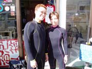 スクール2日目のぎぶん&ねねです。あららららぁ〜。2人とも朝からノリノリです。(→写真参照)ウエットの上からブーメラン海パンをはくという、見事なコーディネイト!ややプロレスラーちっくではありますが。。。今日はいろいろ練習したよ!水中で器材を取り外したり、エア切れの時どうするかなどなど。。 午後からは、お勉強ターイム!そして夕方からは、恐怖のTESTだぁ! 2人とも高得点にてクリアー! あした海にもぐれば、合格だね。もうすぐダイバーだ! |